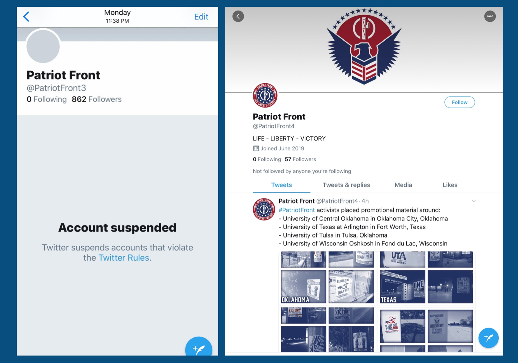 *The Patriot Front (@PatriotFront3) Twitter account was suspended by Twitter on or around October 7, 2019. A Twitter account named Patriot Front (@PatriotFront4) which was created, was active and posting tweets as of October 7, 2019.