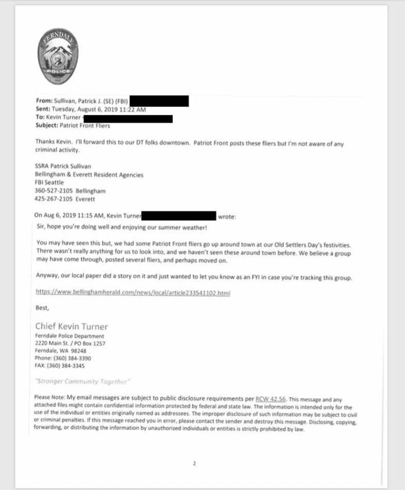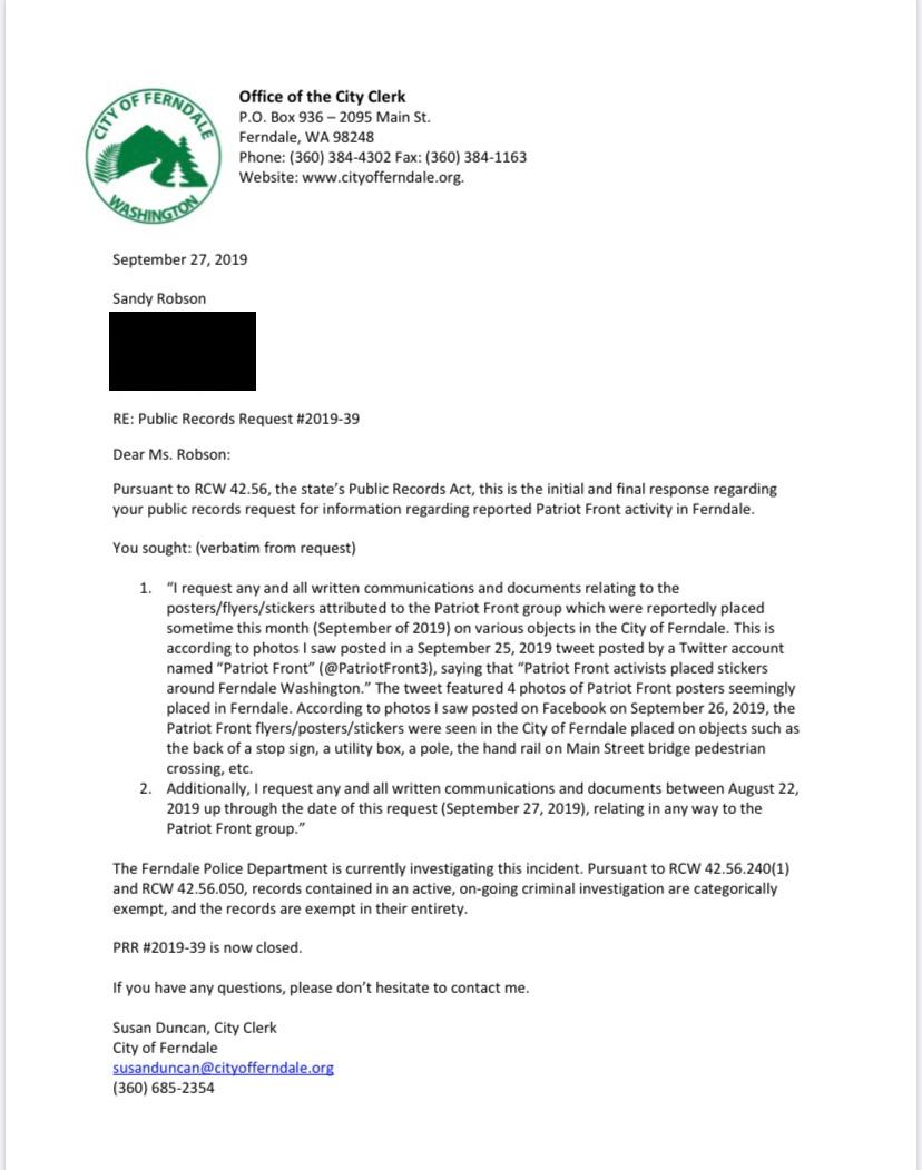 The City of Ferndale provided me the August 6 email record between Chief Turner, and Patrick Sullivan with the Bellingham and Everett Resident Agencies, FBI Seattle. However, in my September 27 records request I was told all of the responsive records were exempted due to there now being an ongoing investigation. This indicated the possibility that there was never an official investigation opened back at the time of the Patriot Front flyering incident in late July.