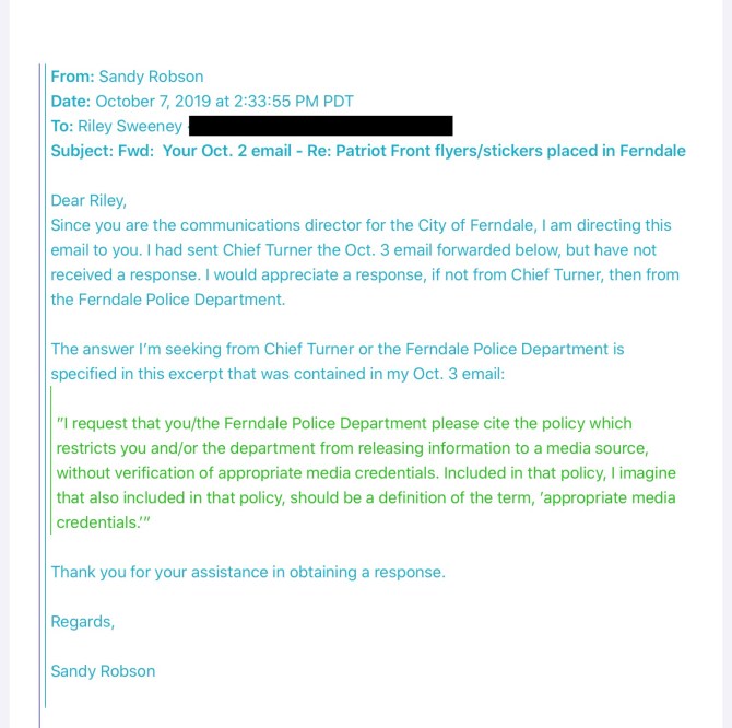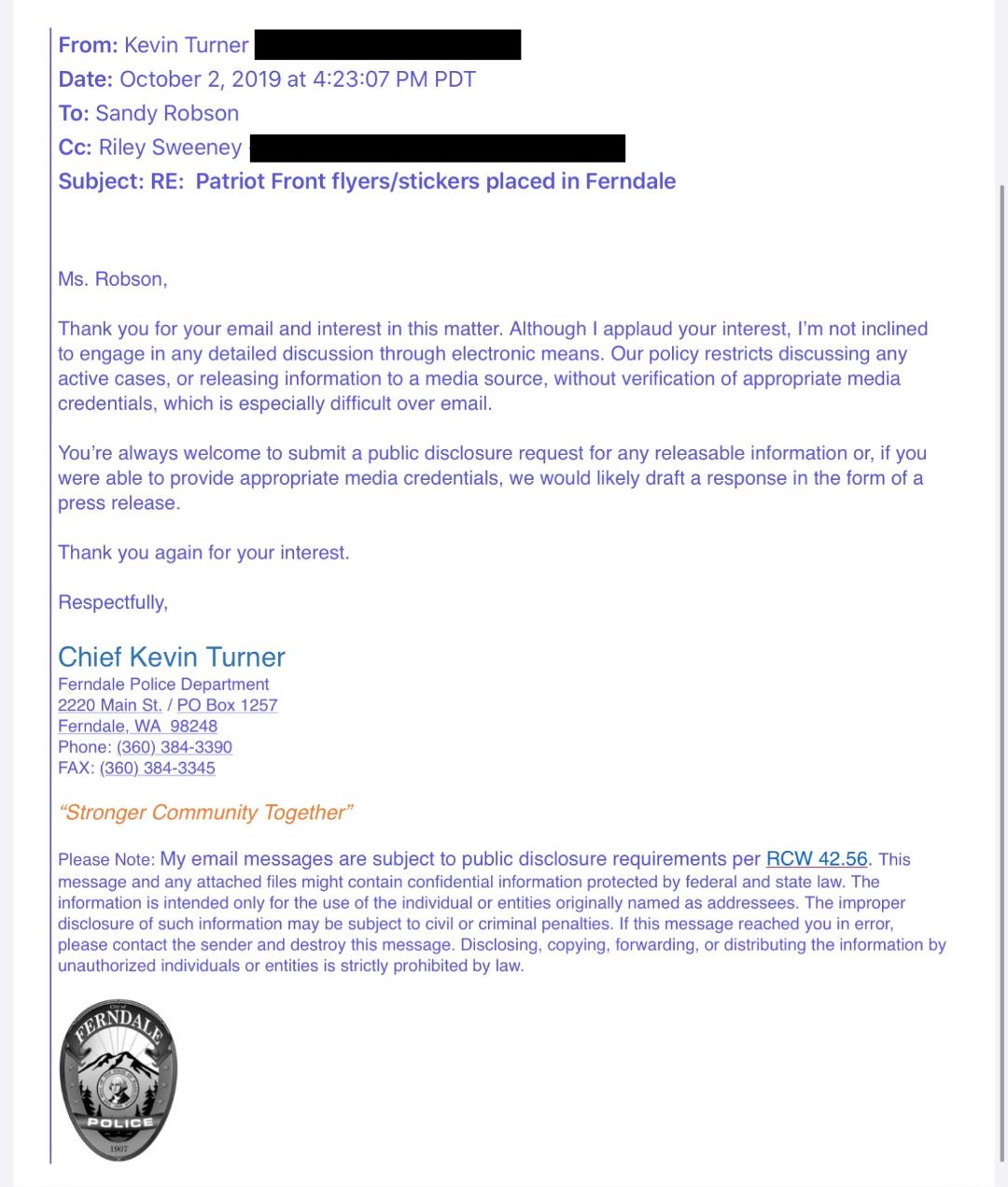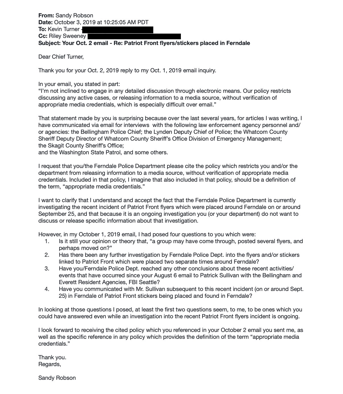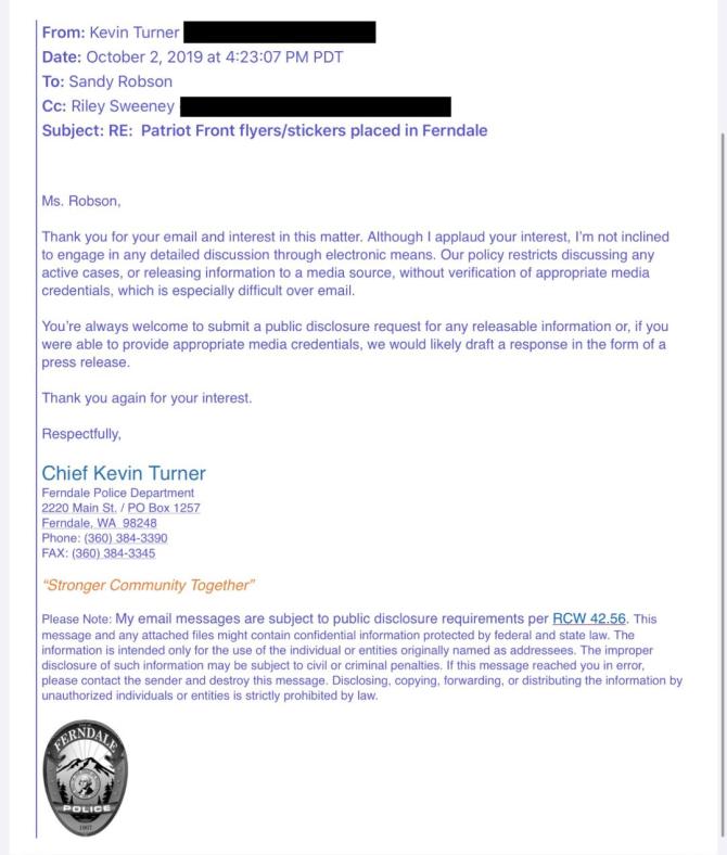 I also told Chief Turner that I understood and accepted the fact that because the Ferndale Police Department has an ongoing investigation into the recent Patriot Front flyering incident in Ferndale that occurred on or around September 25, he/his department does not want to discuss or release specific information about that investigation.