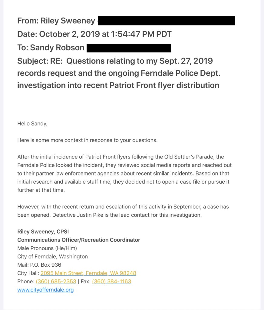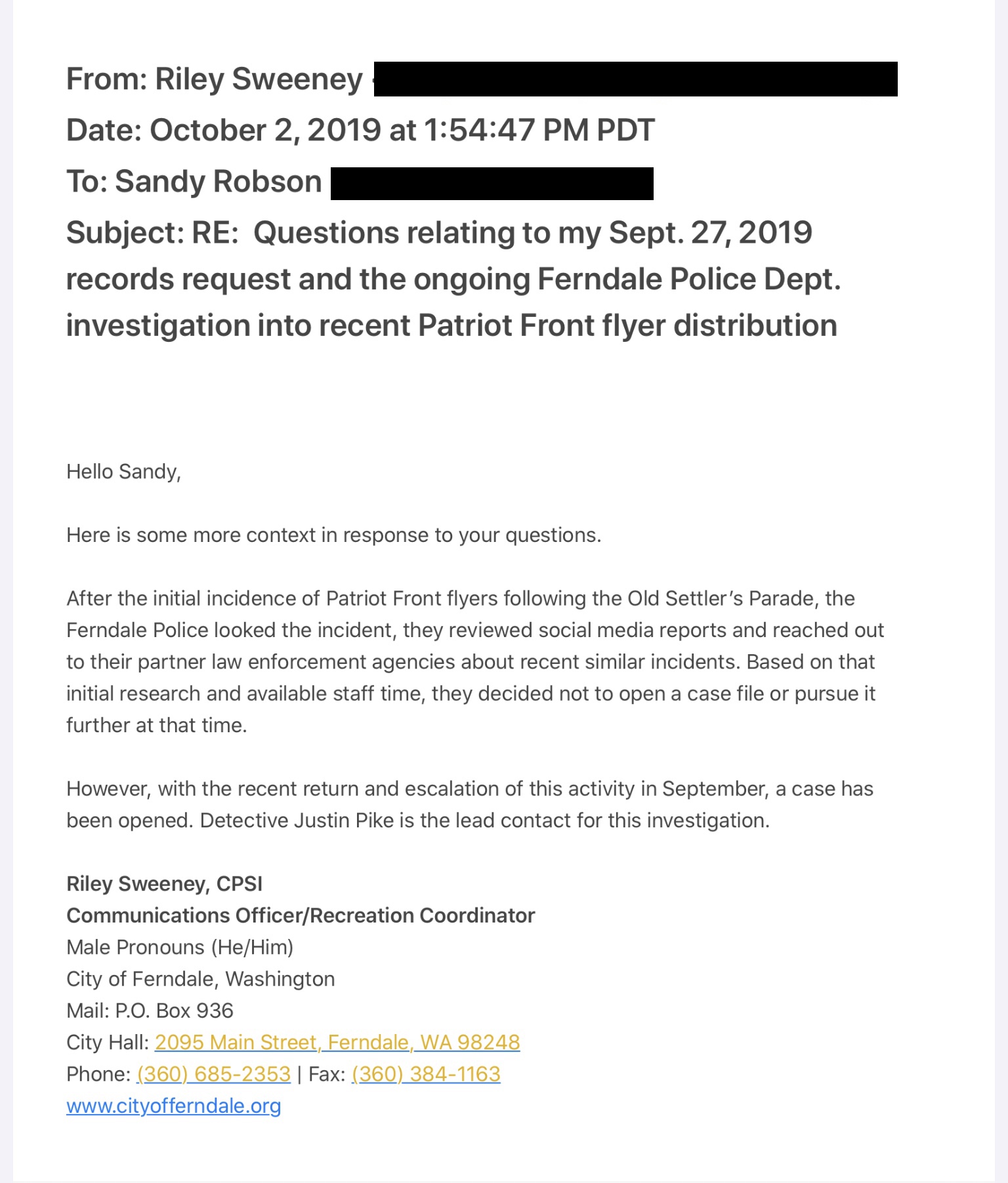 So, I sent an October 2, 2019 email inquiry to Riley Sweeney, asking if there was, in fact, an official investigation launched after the initial incident of Patriot Front flyers which were placed in downtown Ferndale on or around July 27.