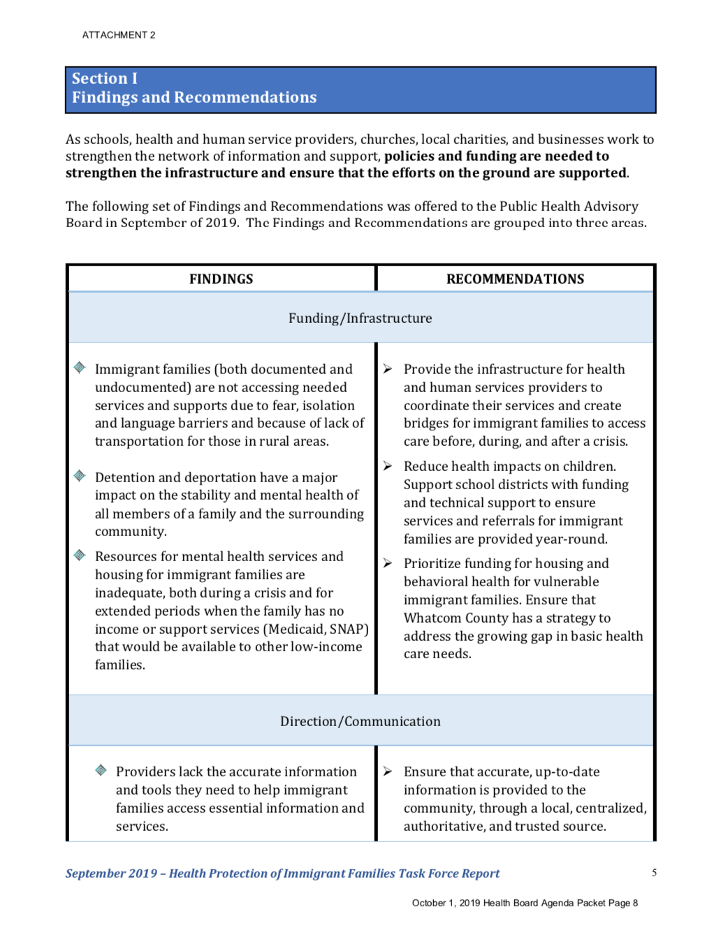 On October 1, 2019, Whatcom County Council, meeting as the County’s Health Board, received an update from the Public Health Advisory Board (PHAB) and a presentation from the Health Protection for Immigrant Families Task Force. The task force had made recommendations to PHAB in accordance with the County Council’s Resolution 2018-050, “Health Protection for Immigrant Families,” passed by the Council in early December 2018.