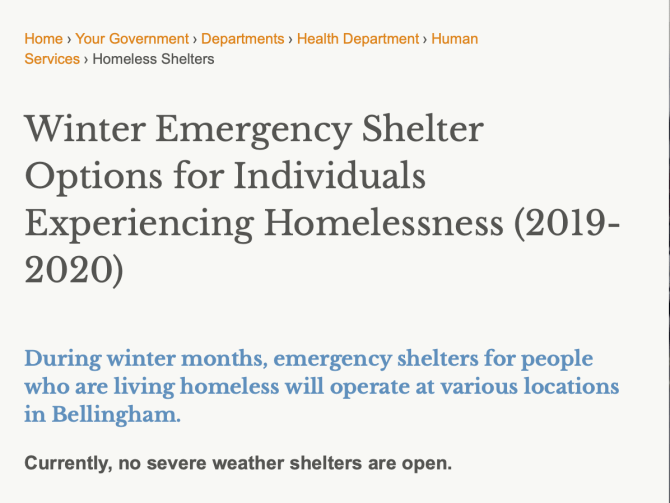 Nighttime lows in Bellingham have been under 28 degrees for the last three nights, according to the National Weather Service. Here is an email I sent to the Homeless Strategies Workgroup tonight: