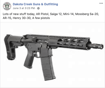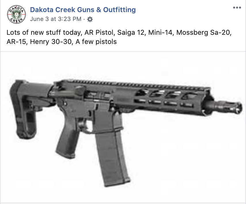 After making what I consider to be this irresponsible and inflammatory June 1, 2020 post, subsequently on the next post displayed, on June 3, 2020, the Dakota Creek Guns & Outfitting Facebook page posted, “Lots of new stuff today, AR Pistol, Saiga 12, Mini-14, Mossberg Sa-20, AR-15, Henry 30-30, A few pistols.”