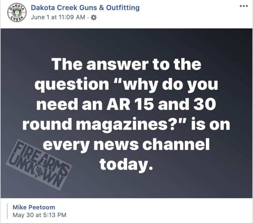 On June 1, 2020, there was a post on that Dakota Creek Guns & Outfitting Facebook page that was a share of a May 30, 2020 post by former candidate for Whatcom County Council, Mike Peetoom. Mr. Peetoom had posted a graphic taken from the “Firearms Unknown” Facebook page (which had posted the message on the morning of May 30, 2020) that read: “The answer to the question ‘why do you need an AR 15 and 30 round magazines?’ is on every news channel today.”