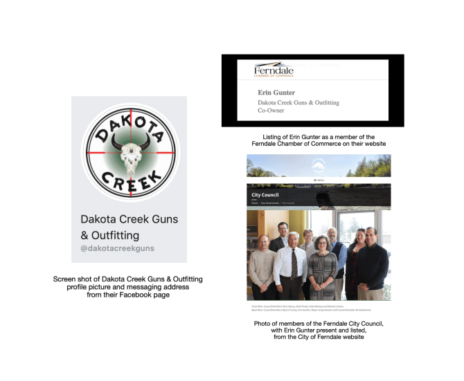 I recently saw a disturbing couple of posts shared on the Facebook page of Dakota Creek Guns & Outfitting, a business for which City Council Member Erin Gunter is listed as a co-owner on the Ferndale Chamber of Commerce website.