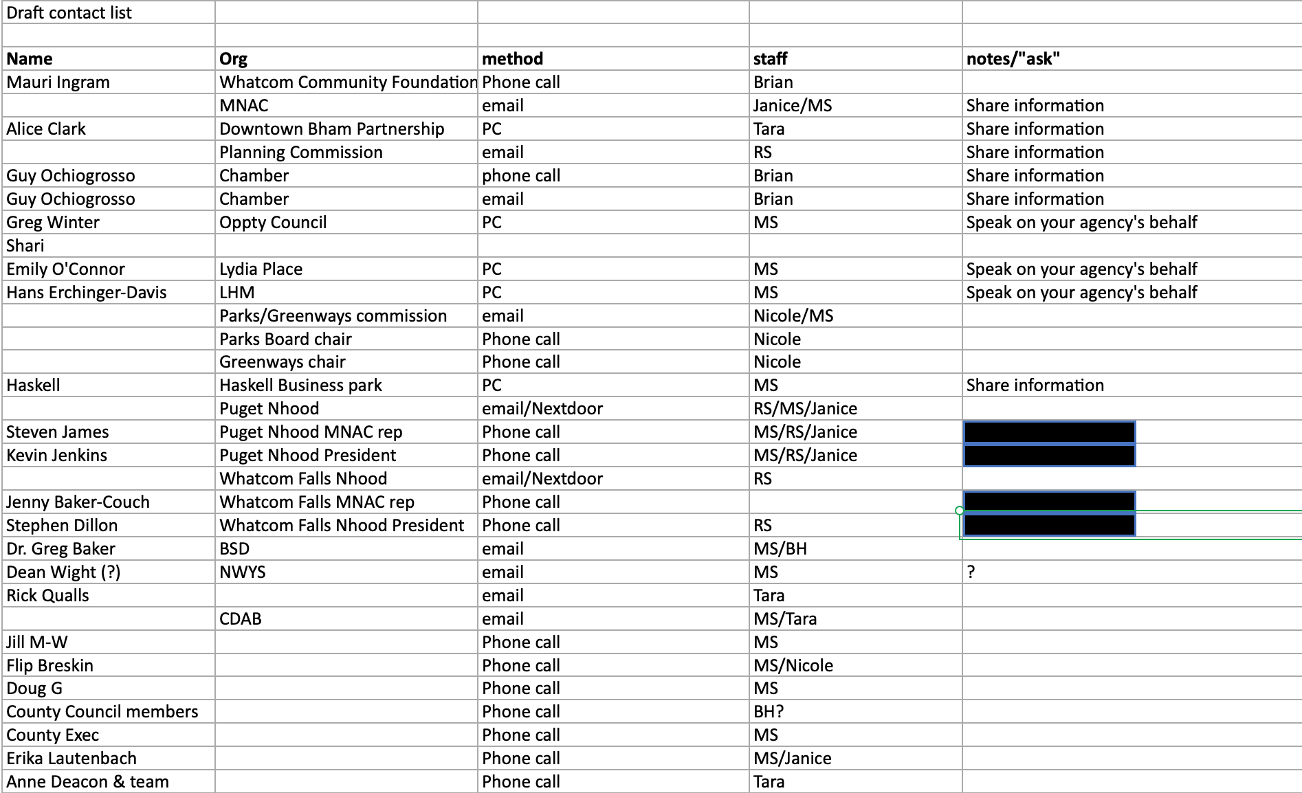 There were names or initials placed in one column of the spreadsheet under the header “staff,” which identified an individual like Mayor Seth, Brian Heinrich, Rick Sepler, Janice Keller, Tara Sundin, or Nicole Oliver, who could be the one to contact a named person.