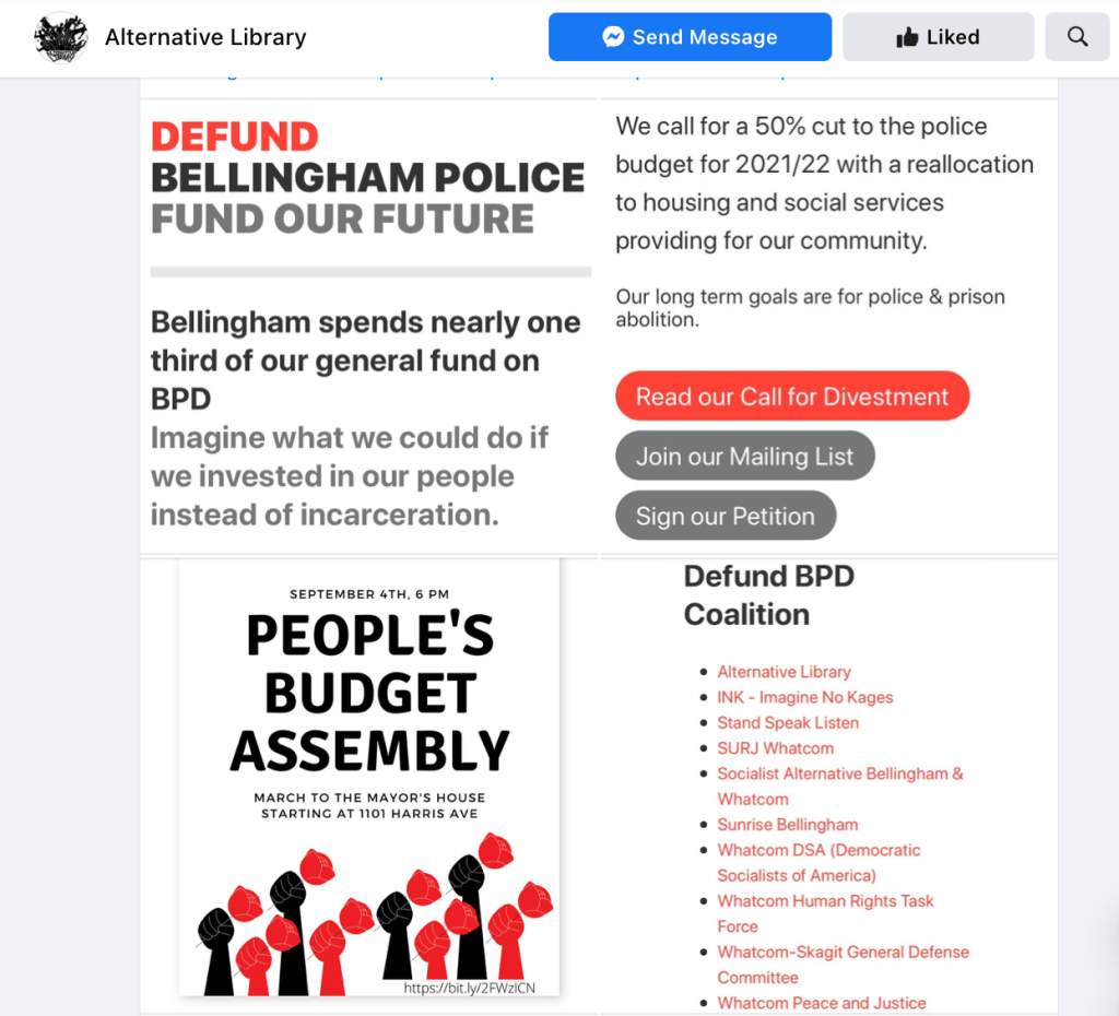 Locally, leading up to the City of Bellingham’s budget decisions being made in December of 2020, many community members had been persistently making phone calls and showing up at public meetings calling for their elected Bellingham representatives to defund the police budget by 50% and to invest in community.