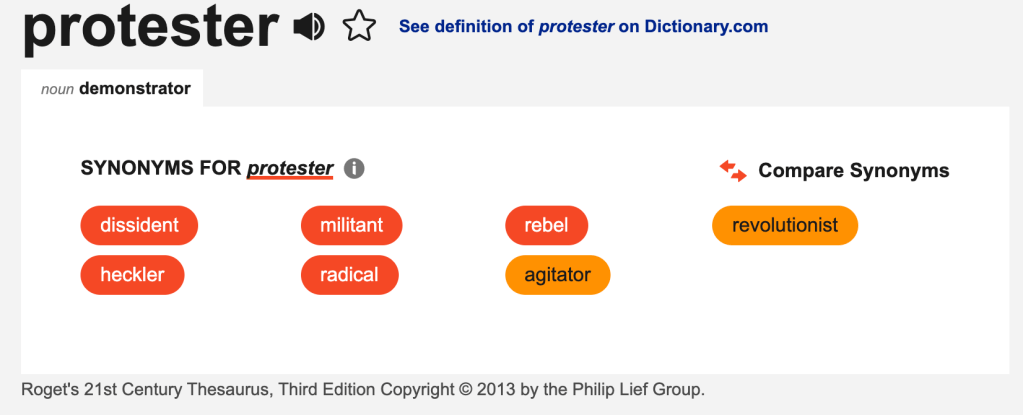 The word “agitator” can appear to be interchangeable with the word “protestor” when looking at dictionary definitions. But consulting a thesaurus reveals the more provocative associations of the word “agitator.” In Simon’s January 28, 4:36 p.m. update she labeled “about 150 of them” with that word, alleging they shouted at officers, threw things at them, and assaulted three specific officers.