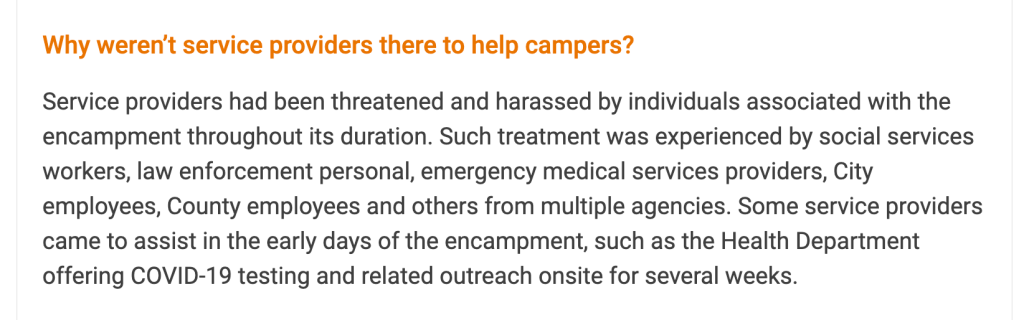 Service providers had been threatened and harassed by individuals associated with the [210 Lottie] encampment throughout its duration. Such treatment was experienced by social services workers, law enforcement personal, emergency medical services providers, City employees, County employees and others from multiple agencies.