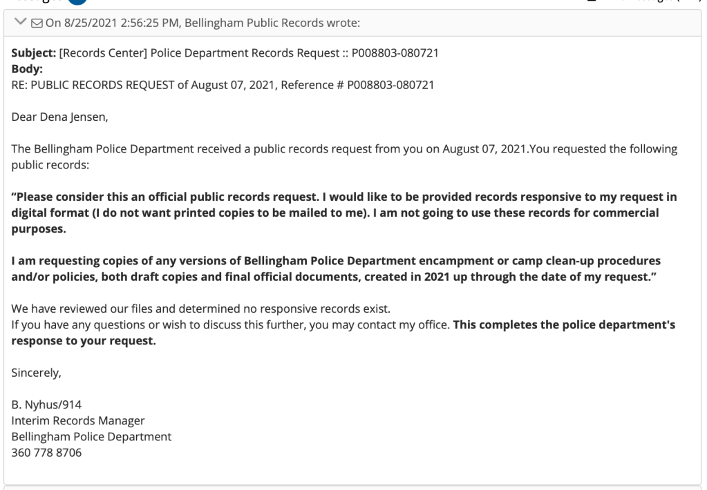 Moreover, while the City is maintaining on their website that it is “identified City staff” who currently review the overall impact of reported camps – and whether or not that identified staff is a BPD employee – BPD involvement is still key to those sweeps being carried out and that involvement is budgeted by the City of Bellingham.