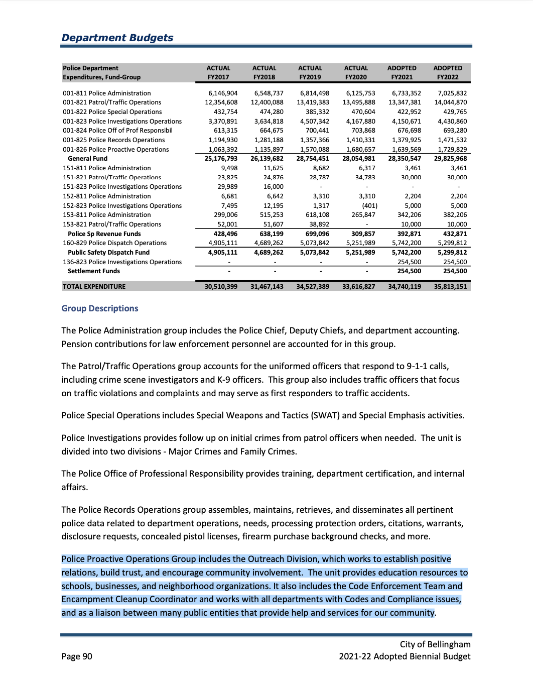 Moreover, while the City is maintaining on their website that it is “identified City staff” who currently review the overall impact of reported camps – and whether or not that identified staff is a BPD employee – BPD involvement is still key to those sweeps being carried out and that involvement is budgeted by the City of Bellingham.