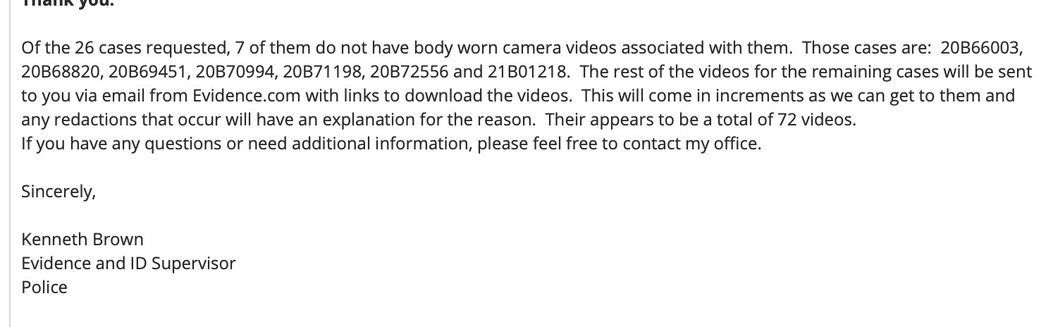 A public records request was made by this writer for body cam footage associated with the case numbers of the incidents with which Lt. Crass had provided Purdy. Body cam footage for 19 of the 26 cases was provided. The BPD Public Records Evidence and ID Supervisor noted that body cam recordings were not associated with 7 of the 26 cases.