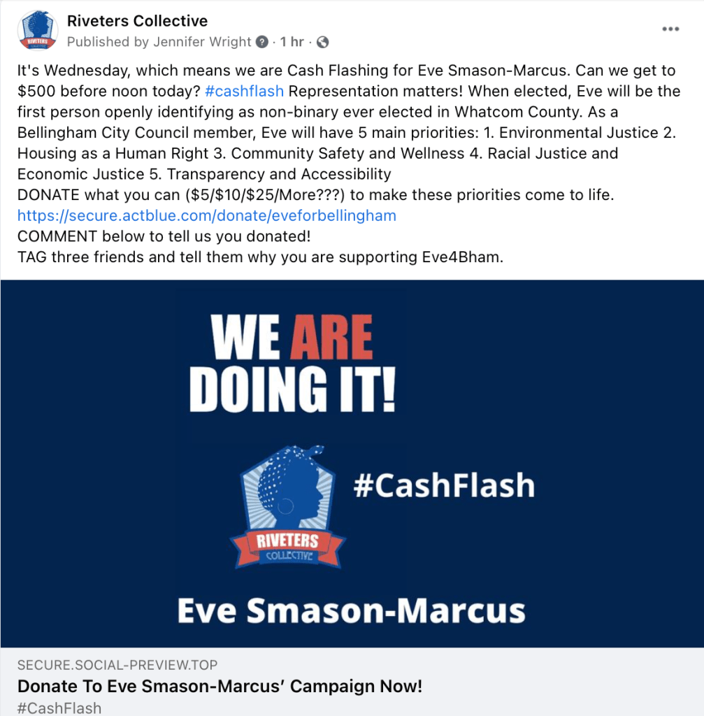Click the graphic of a Riveters Collective Facebook post promoting and providing an option to donate to Eve Smason-Marcus’ grassroots campaign for Bellingham City Council position, Ward 6