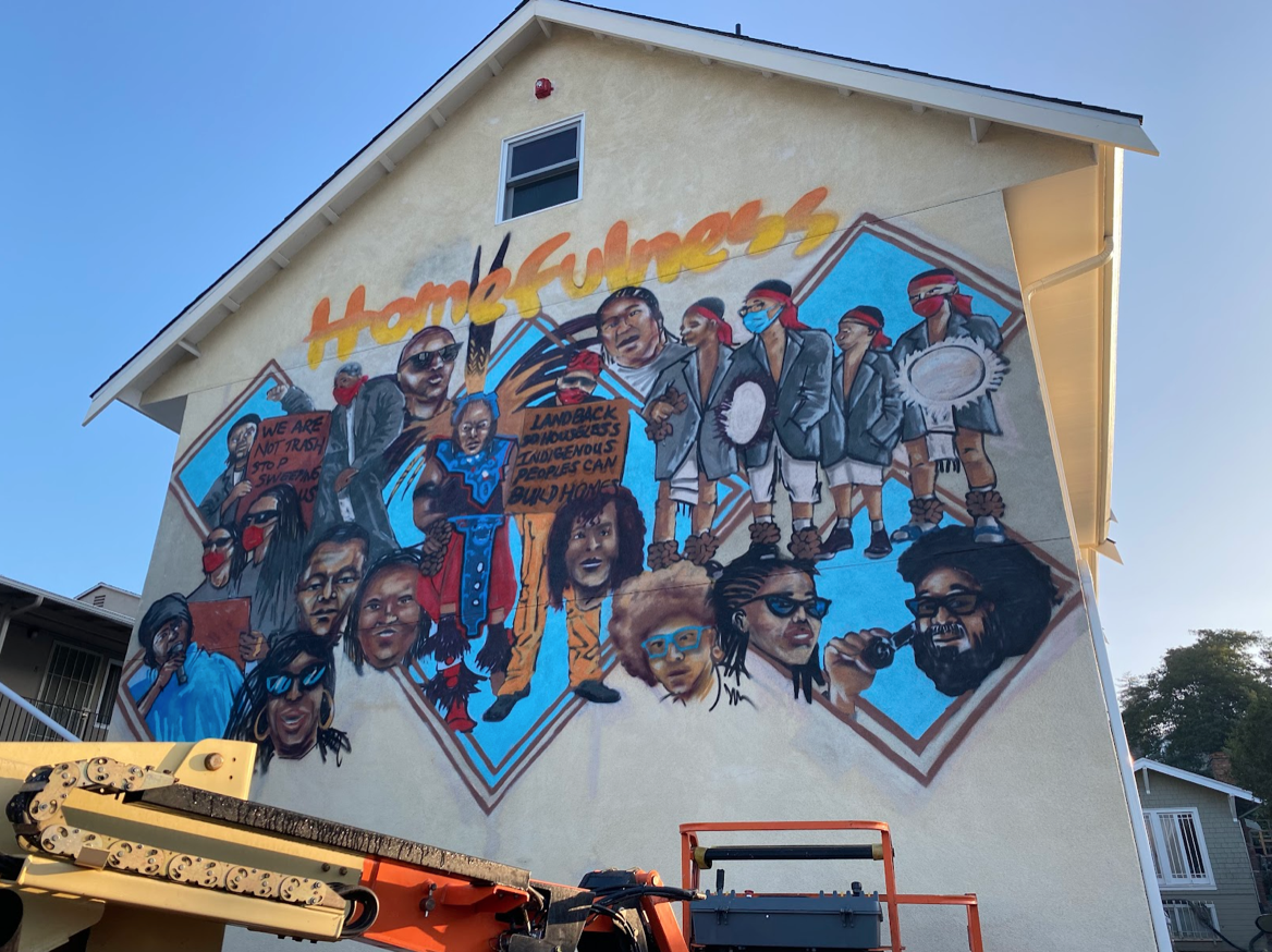 Image – included with the press release – of mural on the side of a building displaying the word Homefulness at the top, in orange and yellow graduated tones. Images of Indigenous people, Black people, and people of color are painted below the lettering, some shown speaking, some shown with drums, some shown with masks, some hold posters. One poster says ‘We Are Not Trash – Stop Sweeping Us.’ The other poster says ‘Land Back so Houseless Indigenous Peoples Can Build Homes.’