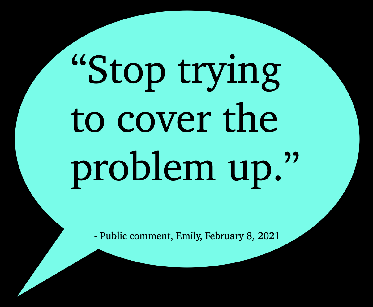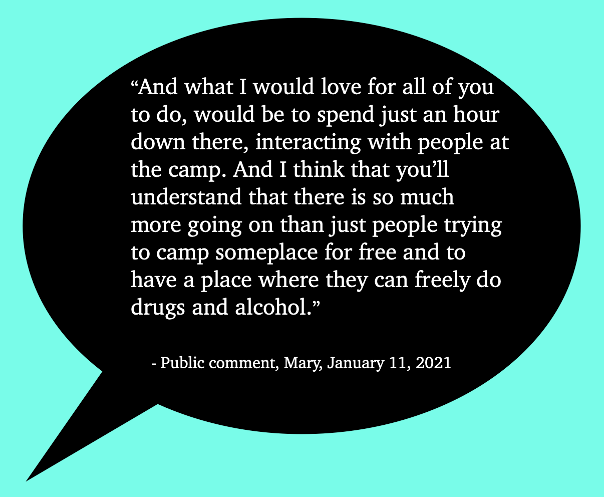 Stone’s remarks about turning a blind eye, and not helping encampments be clean, and not engaging people with services don’t seem to be based on any of the very public calls to action related to encampment sweeps made by community members during the 2020/2021 winter season. People can find many of those calls to action in this blog post, “Bellingham City Council public comment transcription project – January 11, 2021 through March 8, 2021.”