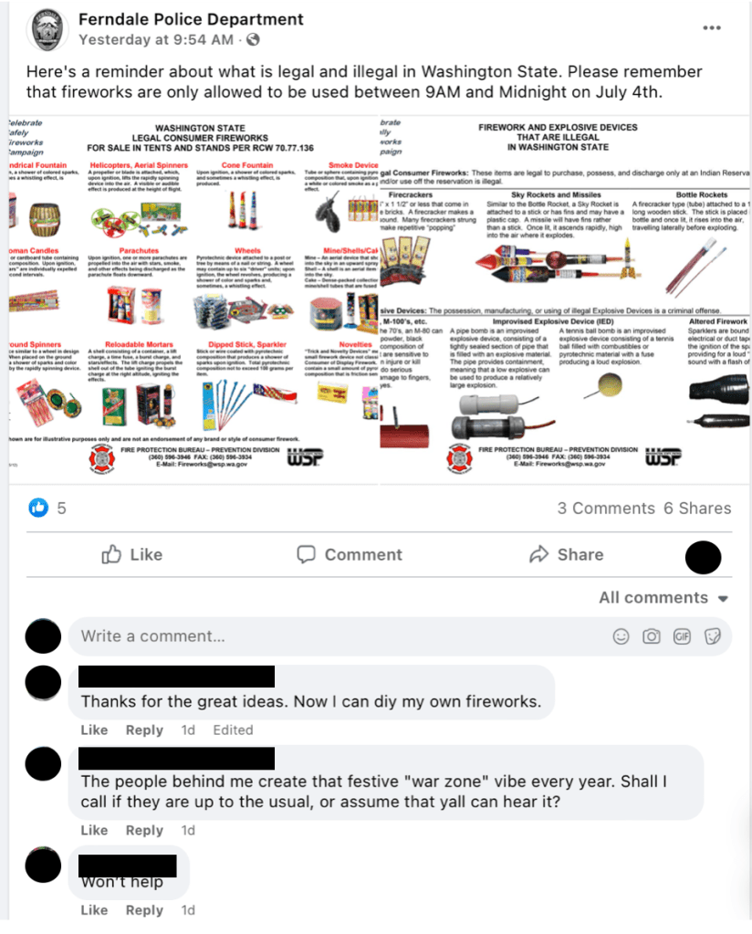 For example, after Mayor Hansen had committed to a “‘much more robust education campaign around the use of fireworks in Ferndale neighborhoods,” in his email to Stewart, there has been only one post about July 4th on the City’s Facebook page leading up to the holiday this year, and it said nothing about fireworks safety.