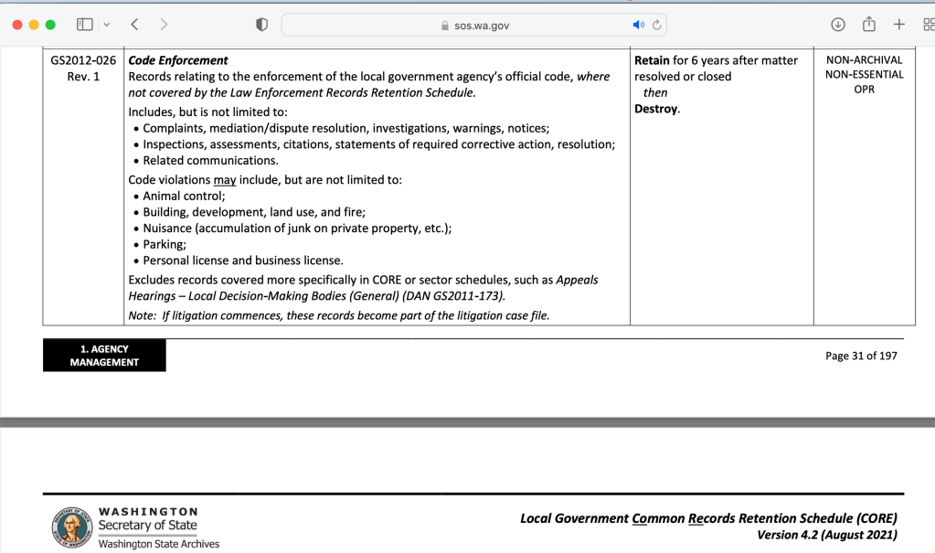 Also, I am including here some specific references from the Washinton Secretary of State’s website related to a couple of key factors regarding retaining text messages, and the length of retention period for records for the enforcement of a local government’s code.