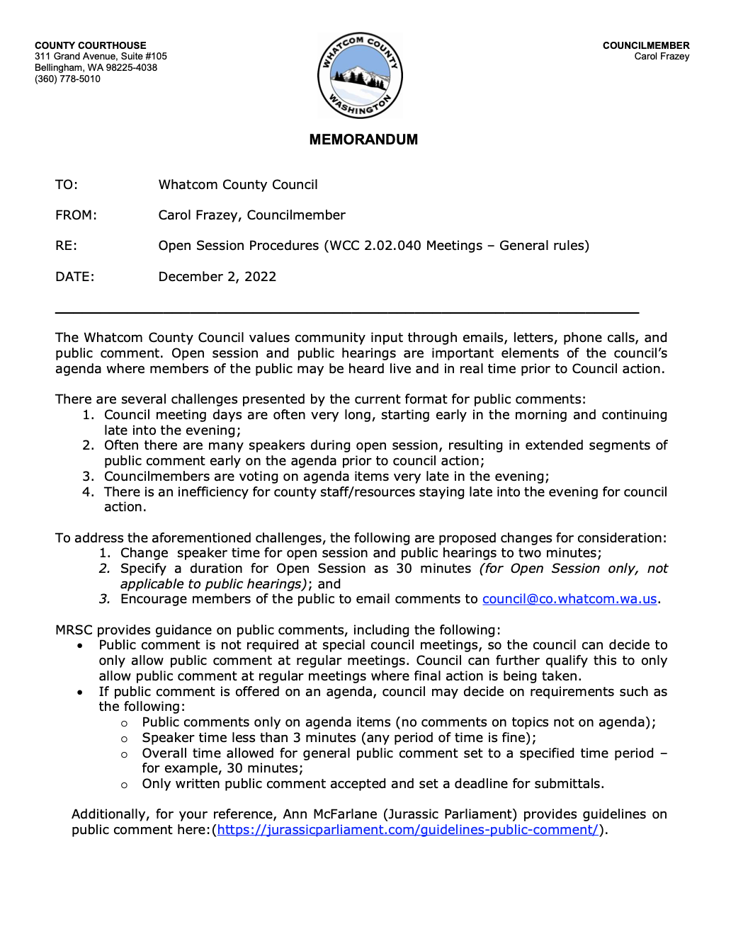 In this post is an email I sent last night regarding tomorrow’s 12/6/22 Whatcom County Council Committee of the Whole meeting. The COW agenda says Council will be discussing general meeting rules. It is left to community members who have some experience on where to find more details, to learn that apparently this discussion is to be solely focused on limiting our time to speak at their meetings. It would have taken very few extra words to say that on the agenda. Here is the link to the memo for the meeting: https://whatcom.legistar.com/View.ashx?M=F&ID=11493559&GUID=01A69383-70BC-41D5-A732-01A369E4CD18