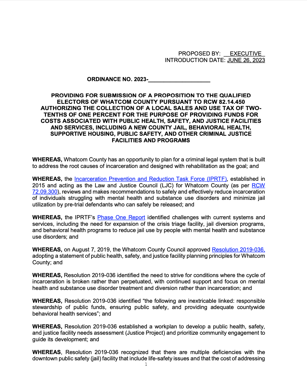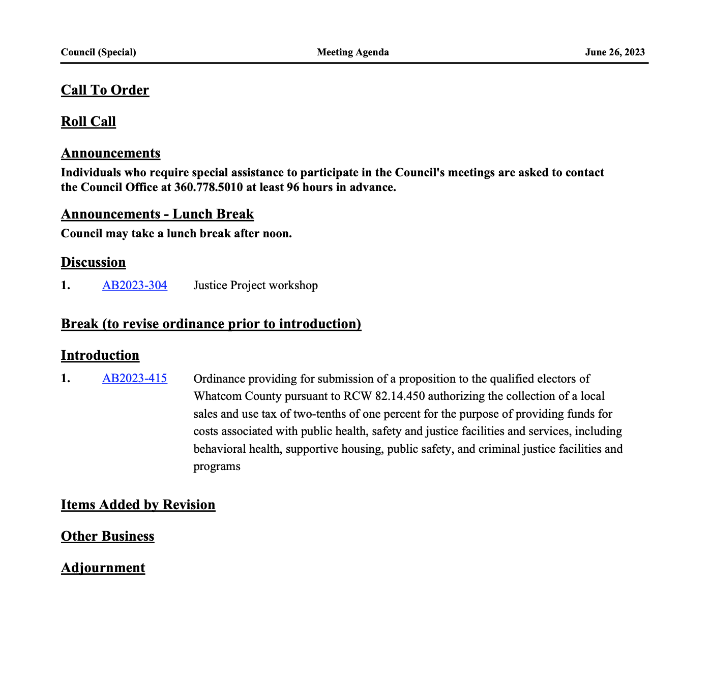 So far, I have made it through watching the first three hours of Whatcom County Council Members’ 10:30 a.m., June 26, 2023 workshop on the draft copy of an ordinance for a sales tax that will potentially fund a new Whatcom County Jail and behavioral health services. I still have a couple hours left of their full workshop that day to finish watching.