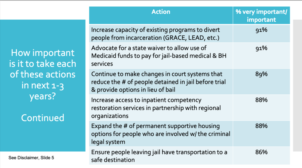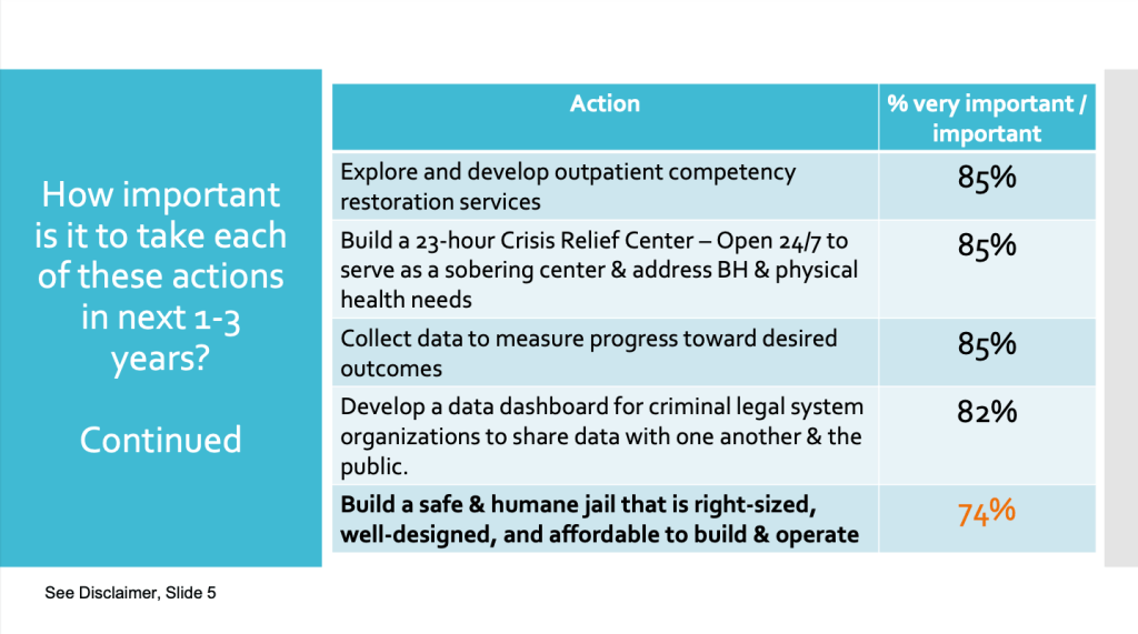 Almost all actions were related to services and reducing incarceration. Only one was exclusively related to the jail, which was the action to “Build a safe & humane jail that is right-sized, well-designed, and affordable to build & operate.”