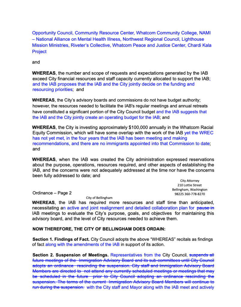 The Bellingham City Council will take its final vote on whether to approve an ordinance to suspend the Immigration Advisory Board at their 7:00 p.m. regular meeting on Monday, February 12, 2024. The vote is scheduled to be the Council’s final item of business that night before open session Public Comment and Adjournment. Here is a link to the agenda: https://meetings.cob.org/Meetings/ViewMeeting?id=3124&doctype=1