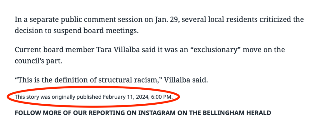 As if that wasn’t quick enough, both of the prominently circulated newspapers in Bellingham announced the Immigration Advisory Board had been suspended even before it happened in a flash on February 12. Both Cascadia Daily News on January 29, 2024 and The Bellingham Herald on February 11, 2024 had respectively reported prior to the City Council’s final vote that the meetings of the IAB had been barred or suspended. Both articles were subsequently “updated.”