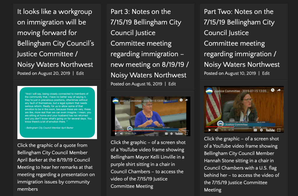 Click this link to view posts on Noisy Waters Northwest about community efforts to protect and ensure the well-being of immigrants in our community: https://noisywatersnw.com/tag/advocacy-toward-immigration-board/