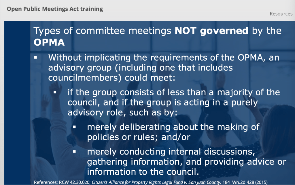 Since that time I have watched a couple different versions of OPMA training, one from the Washington State Attorney General’s website and one from the Association of Washington Cities. I am attaching relevant slides from the trainings, of which I took screenshots.