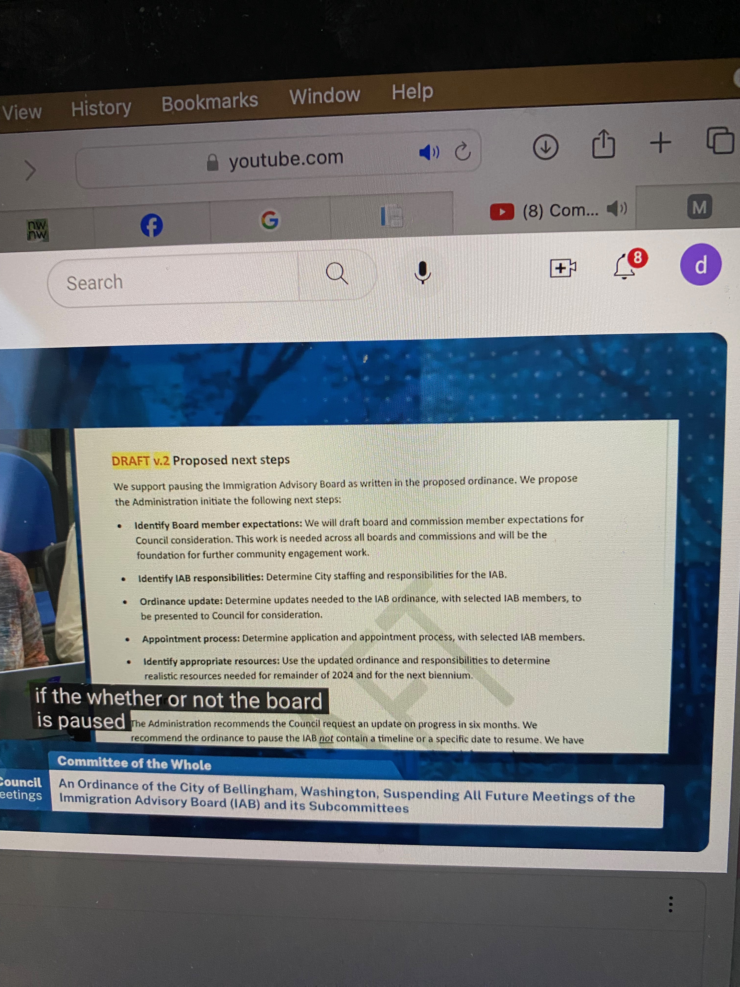 This document was referenced in a list of five “Proposed Next Steps” drafted by the City’s Interim Deputy Administrator Janice Keller which was presented to Bellingham City Council Members on January 29, 2024 at their Committee of the Whole meeting where Council Members took their first vote to approve the ordinance to suspend the meetings of the Immigration Advisory Board.