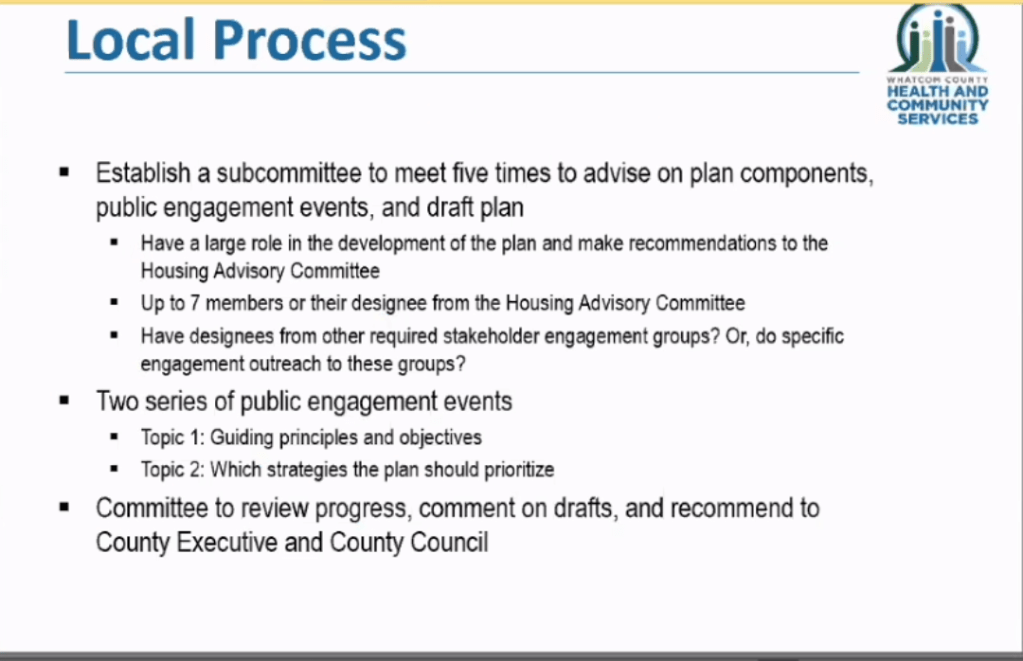 I was able to attend and make a screen recording of most of the December 12, 2024 Whatcom County Housing Advisory Committee meeting, which is the last time the committee met. One of the early presentations in the meeting described the planning process for the 5 year plan. My notes from the Housing Advisory Committee discussion of the plan are included later in this blog post.