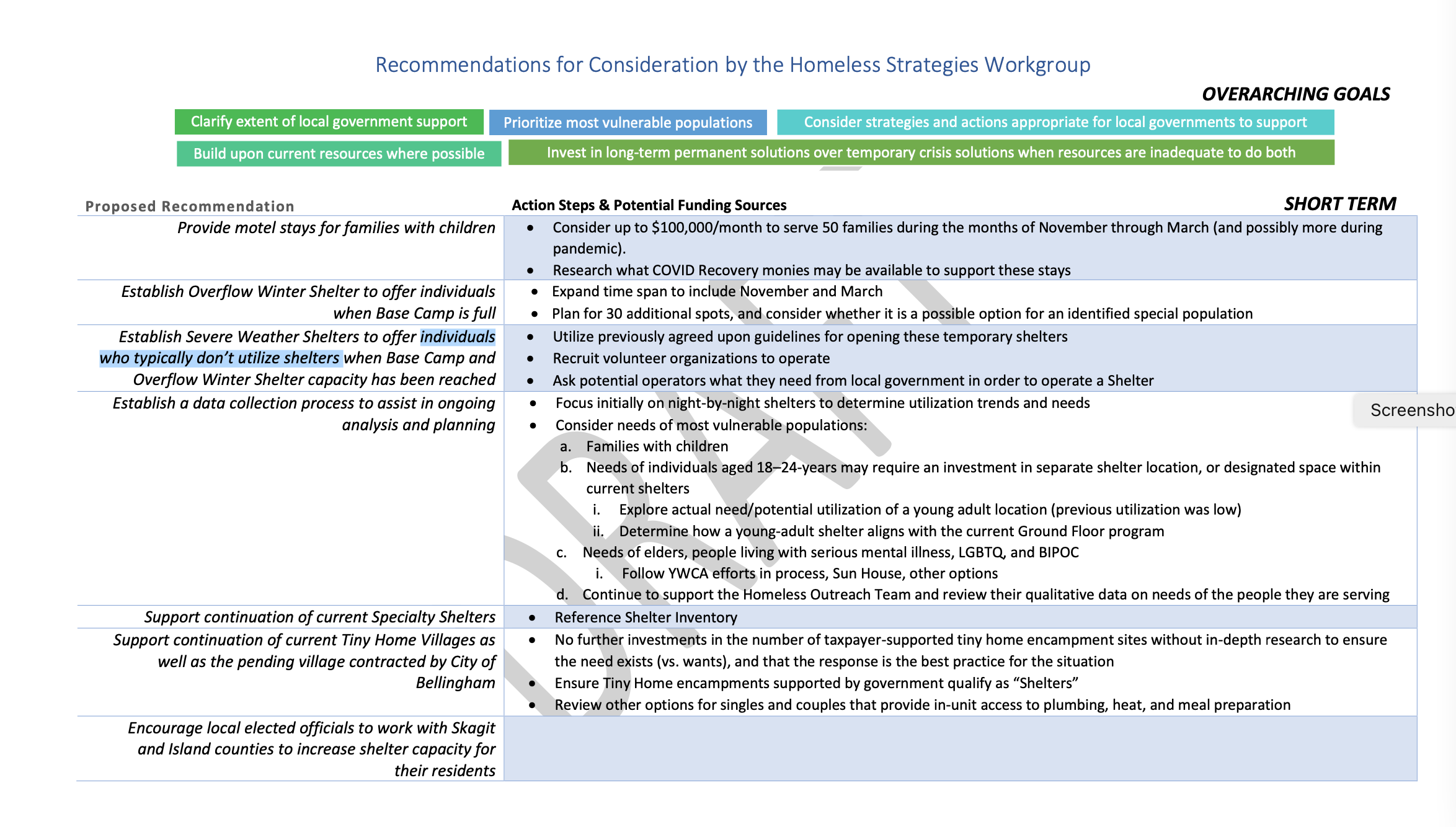 Near the end of the the April 16, 2021 Homeless Strategies Workgroup meeting discussion, a motion was approved by the workgroup to recommend to Whatcom County Council a recommendation from Health Department/County staff. This guidance was a short term action step to establish a data collection process to assist in ongoing analysis and planning.