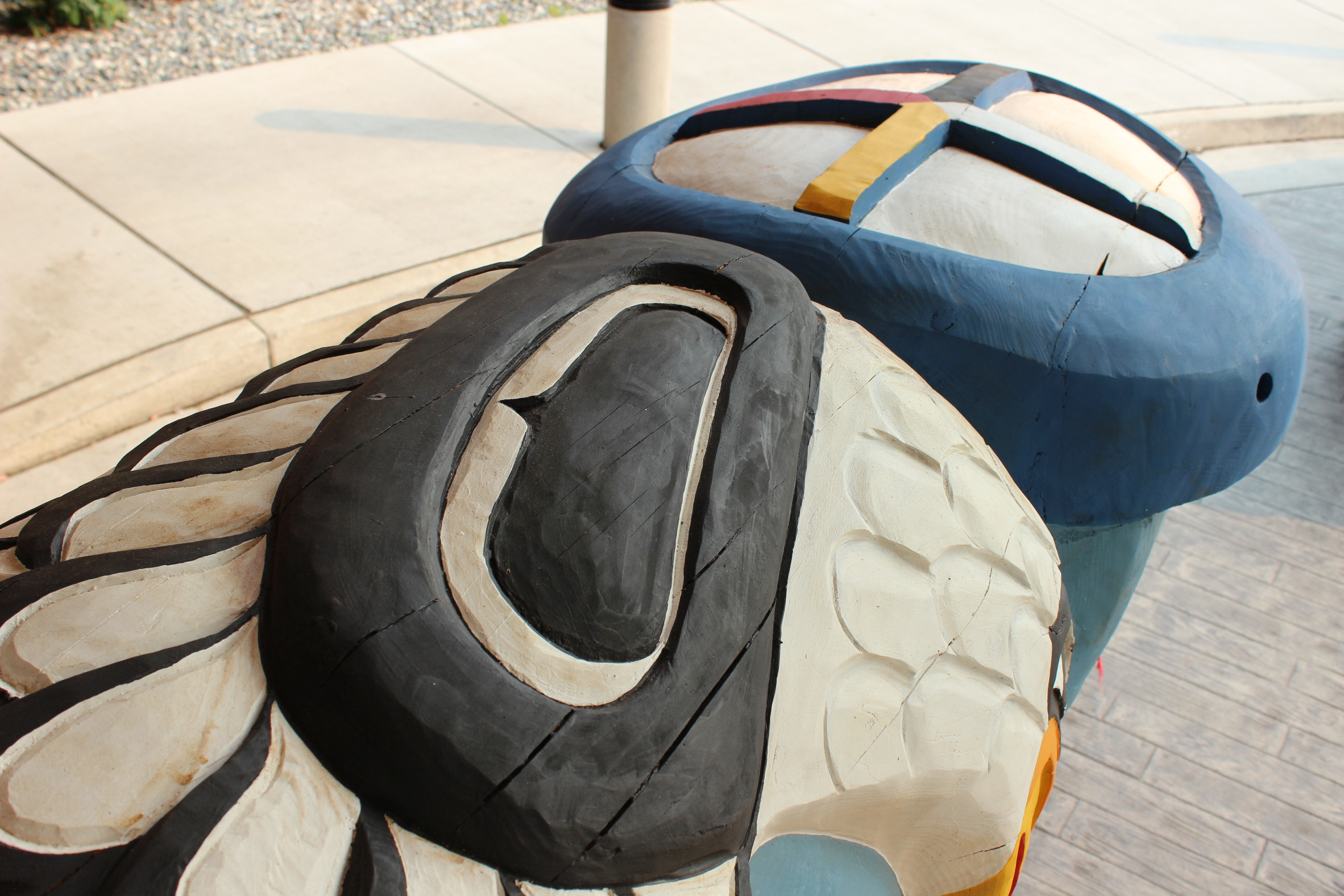 Detail of the top of the Totem Pole created by the House of Tears Carvers of Lummi Nation for the 2015 Totem Pole Journey that traveled along the same rail route that could carry coal and oil to the Salish Sea should west coast terminals be approved.