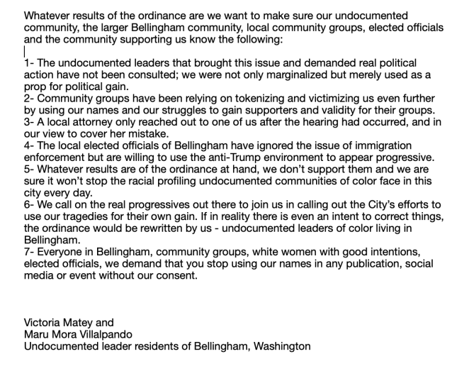 Excerpt from the March 6, 2019 “Open letter to Bellingham City Council” by Victoria Matey and Maru Mora Villalpando